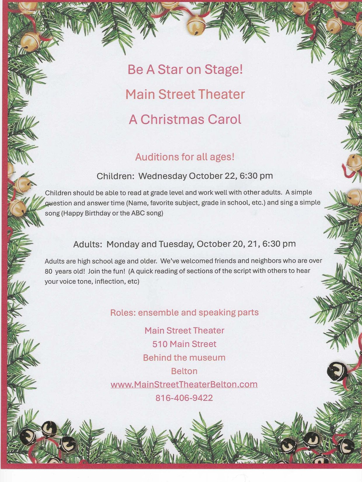 Main Street Theater, LLC provides live entertainment using the gifts and talents of local performing artists. Our dream is a collaborative and cooperative endeavor with all areas of theater arts working together appreciating all that each person has to offer. While the actors are the most acclaimed in any theatrical production, we hope to provide visibility for the behind- the-scenes artists. From technical work of computer technology, lighting and sound to the backstage support team, costumers, properties, and stage management, all artists will be recognized and respected.